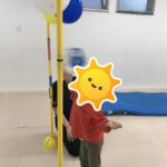 ぶら下がっている風船と下のフープから出ないようにジャンプして